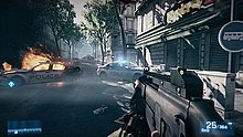 Battlefield 3 features the combined arms battles across single-player, co-operative and multiplayer modes. It reintroduces several elements absent from the Bad Company games, including fighter jets, the prone position and 64-player battles on PC.